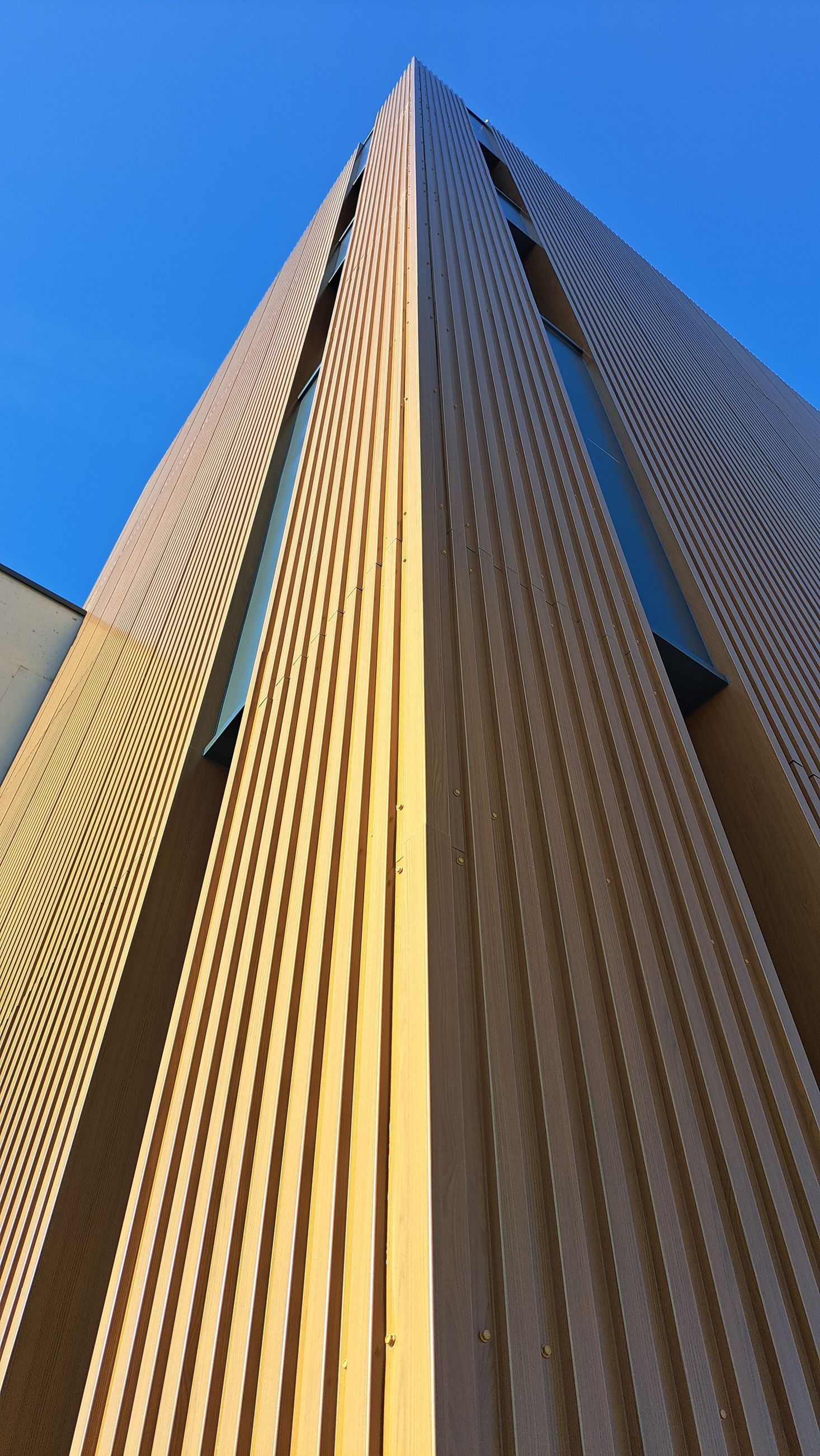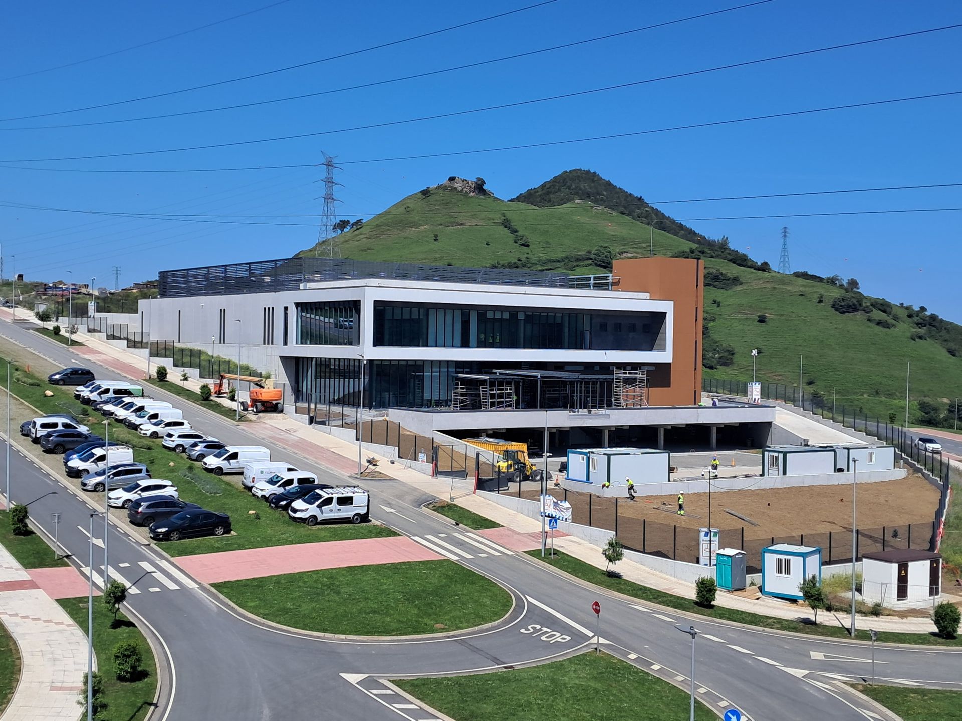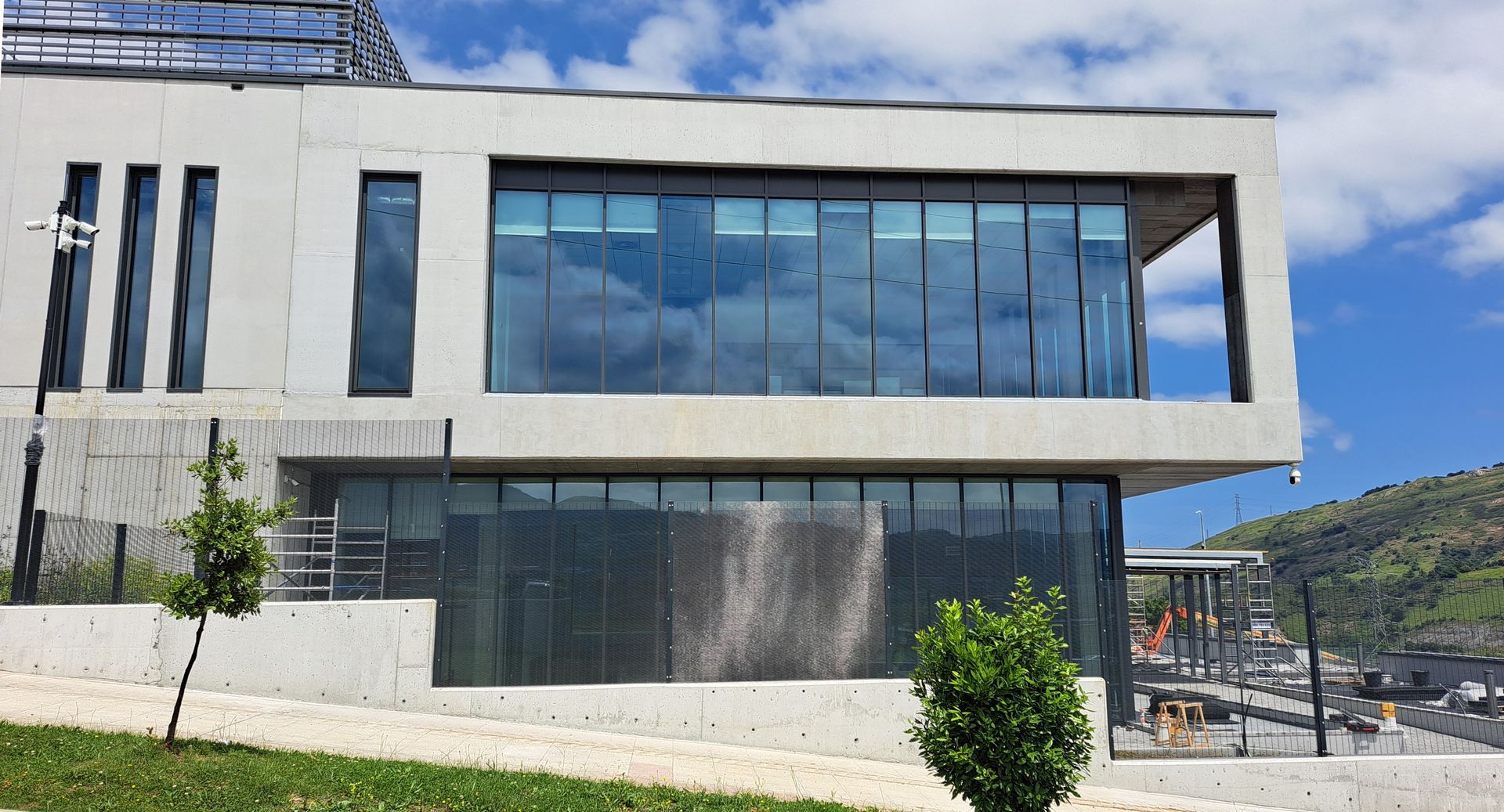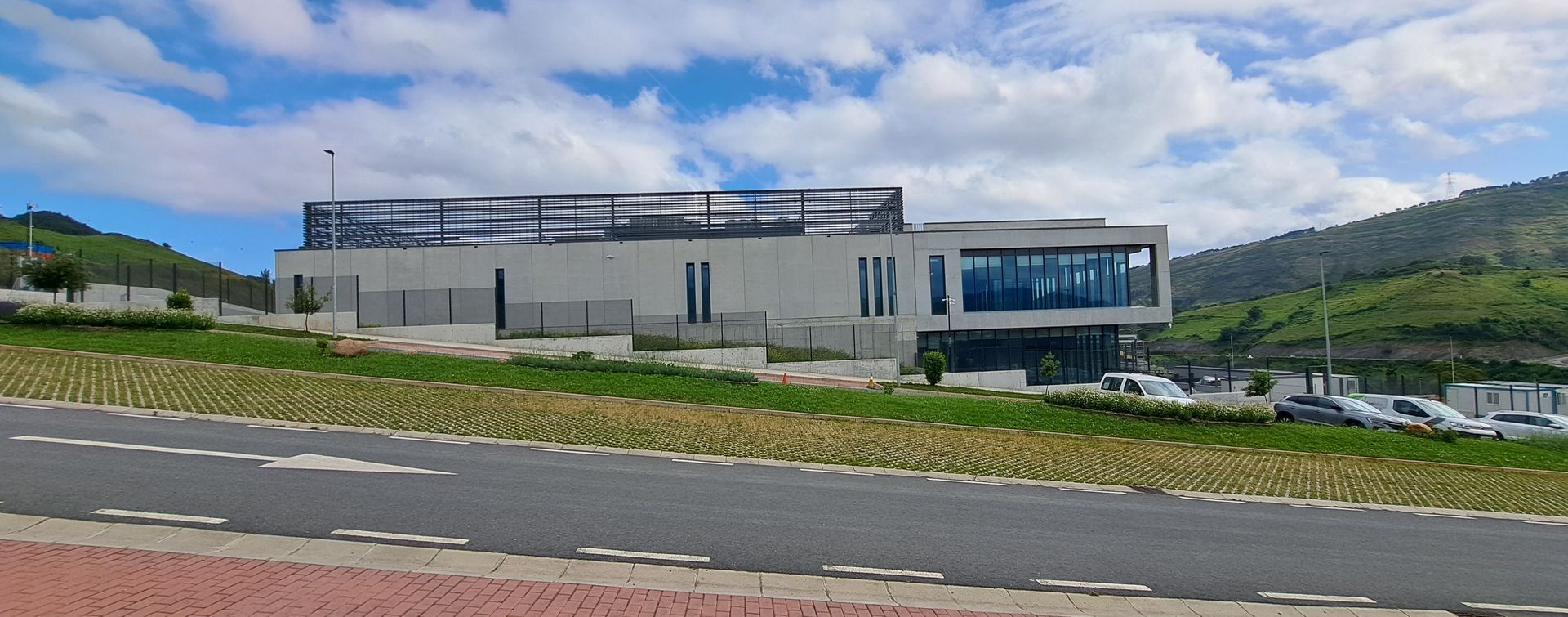 El tratamiento de fachada difiere en función del uso, así para darle un carácter más amable se dispone en la zona de oficinas de cerramientos a base de muro cortina protegido solarmente con unos voladizos y un cerramiento de chapa en el núcleo de comunicación. Se reserva el cerramiento de panel prefabricado para la zona industrial, que, por el uso, requiere de menores aberturas al exterior. La cubierta dispone de un cerramiento de lamas para tamizar las instalaciones y protegerse de los fuertes vientos de la zona.
