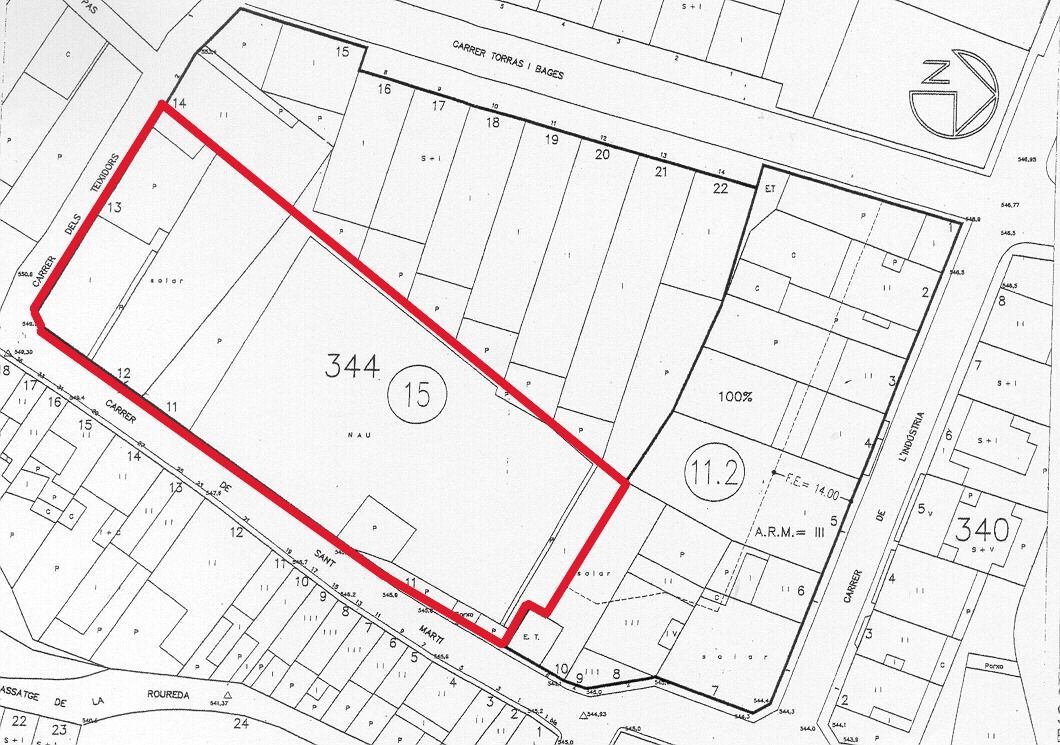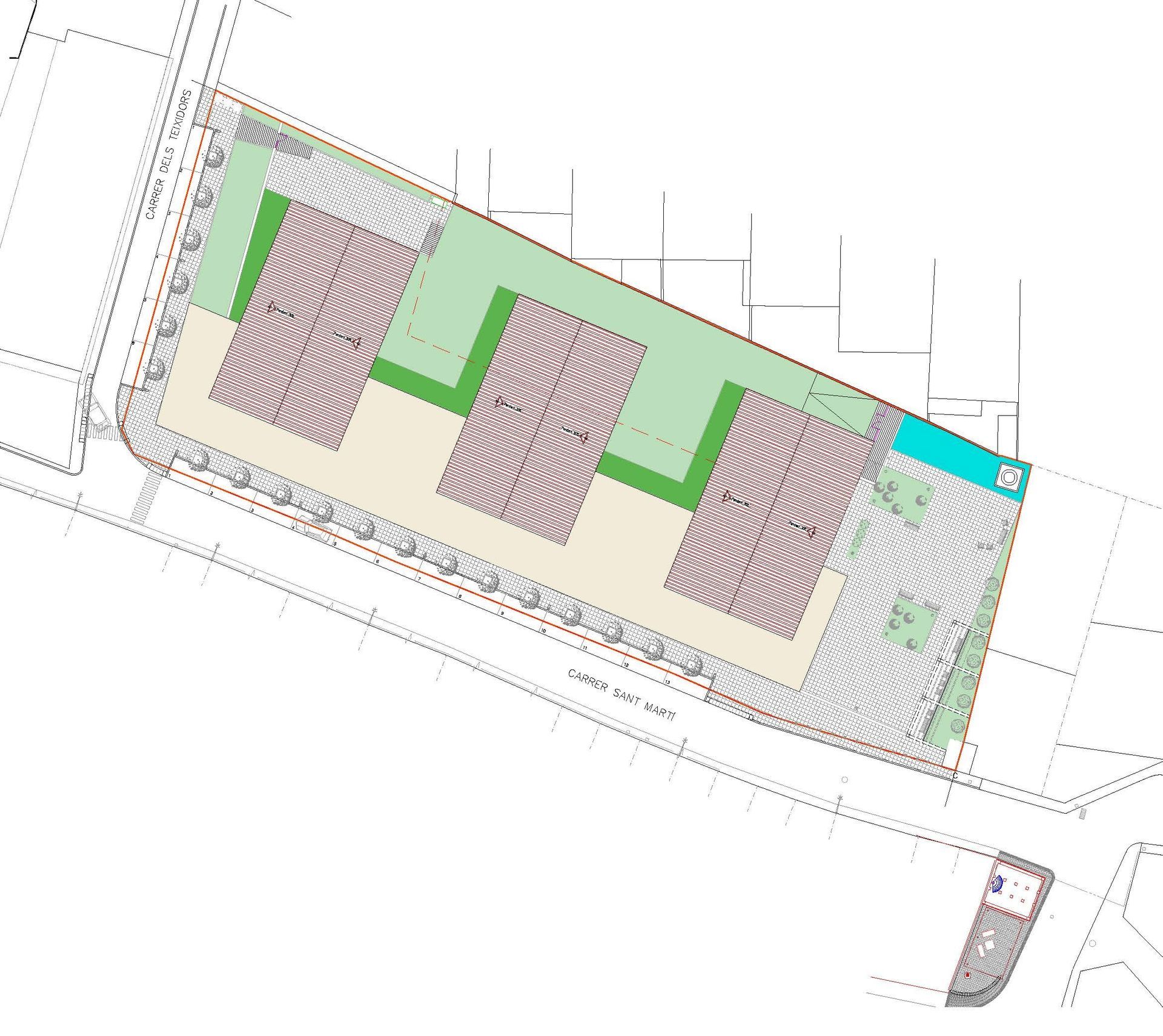 El solar limita al norte con suelo urbano calificado de zona de ensanche tradicional, al oeste con la calle de Sant Martí, al sur con un solar no edificado calificado zona de industria urbana y al este con los patios posteriores de las naves de la zona de industria